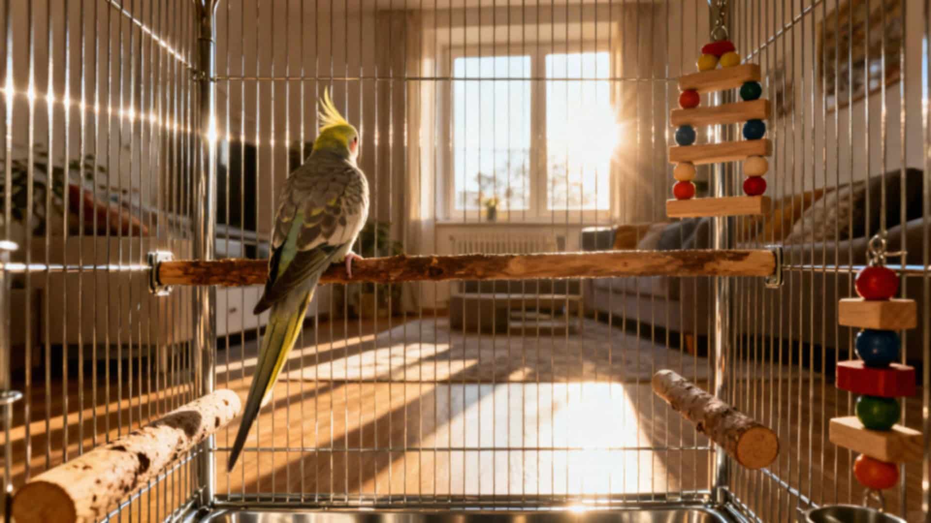 Miski na wodę i pokarm najlepiej ze stali nierdzewnej lub ceramiki — myj je codziennie. Klatkę ustaw z dala od kuchni, przeciągów i hałasu, unikaj bezpośredniego, silnego słońca. Przed wypuszczeniem ptaka sprawdź okna, lustra, wentylatory oraz obecność trujących roślin w pomieszczeniu.